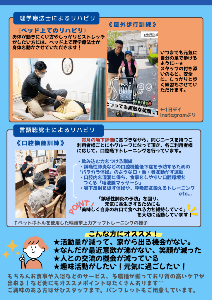 「ごはんを食べてみたい!」「お風呂入りたい!」「運動やリハビリをしてみたい!」という方も体験だけでも遊びに来てみて下さい✨